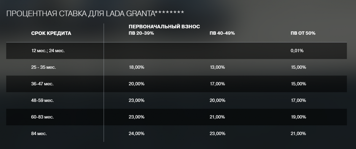 ******** ПСК: 0,149%–33,369% годовых. Ставка по кредиту 0,01% действует при приобретении нового автомобиля LADA Granta с механической коробкой передач в комплектации Classic (ТС) по программе GRANTA EXCLUSIVE. Валюта кредита — рубли РФ; первоначальный взнос — от 50%; срок кредита — 12 и 24 мес.; сумма кредита — от 200 000 руб. Предложение действует при условии единовременного оформления на ТС договора имущественного страхования КАСКО в любых страховых компаниях, выбранных заемщиком и соответствующих требованиям Банка. Возврат кредита — ежемесячные (аннуитетные) платежи. Обеспечение — залог приобретаемого ТС. Оценивайте свои финансовые возможности и риски. Действительно до 30.06.2025. Предложение ограничено. Не оферта. Подробности по тел. +7 (812) 470-96-79