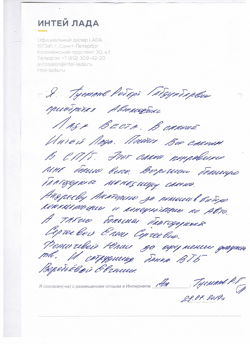 Я, Гусманов Роберт Габдулбарович приобретал автомобиль Лада Веста. В салоне Интей Лада. Посетил все салоны в Спб. Этот салон понравился мне больше всего. Выражаю большую благодарность менеджеру салона Андрееву Анатолию, за помощь в выборе комплектации по авто. А также большая благодарность Сергеевой Елене Сергеевне, Фомичевой Юлии, за оформление документов. И сотруднику ВТБ Воробьевой Евгении. |