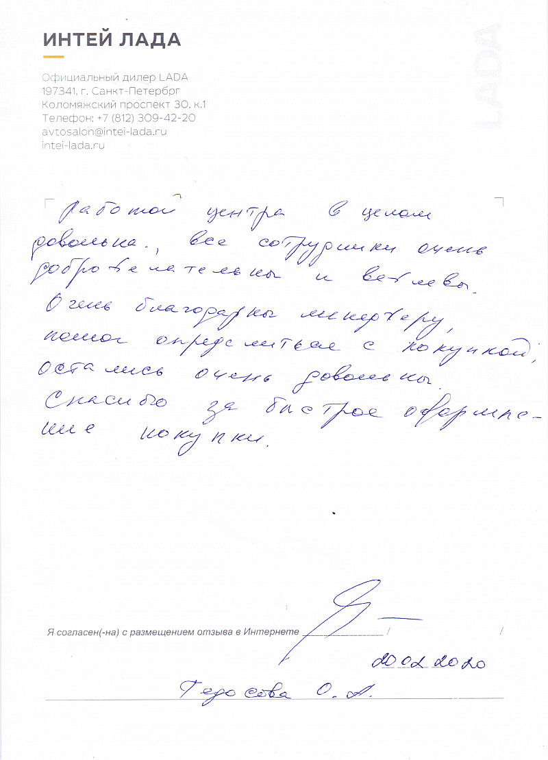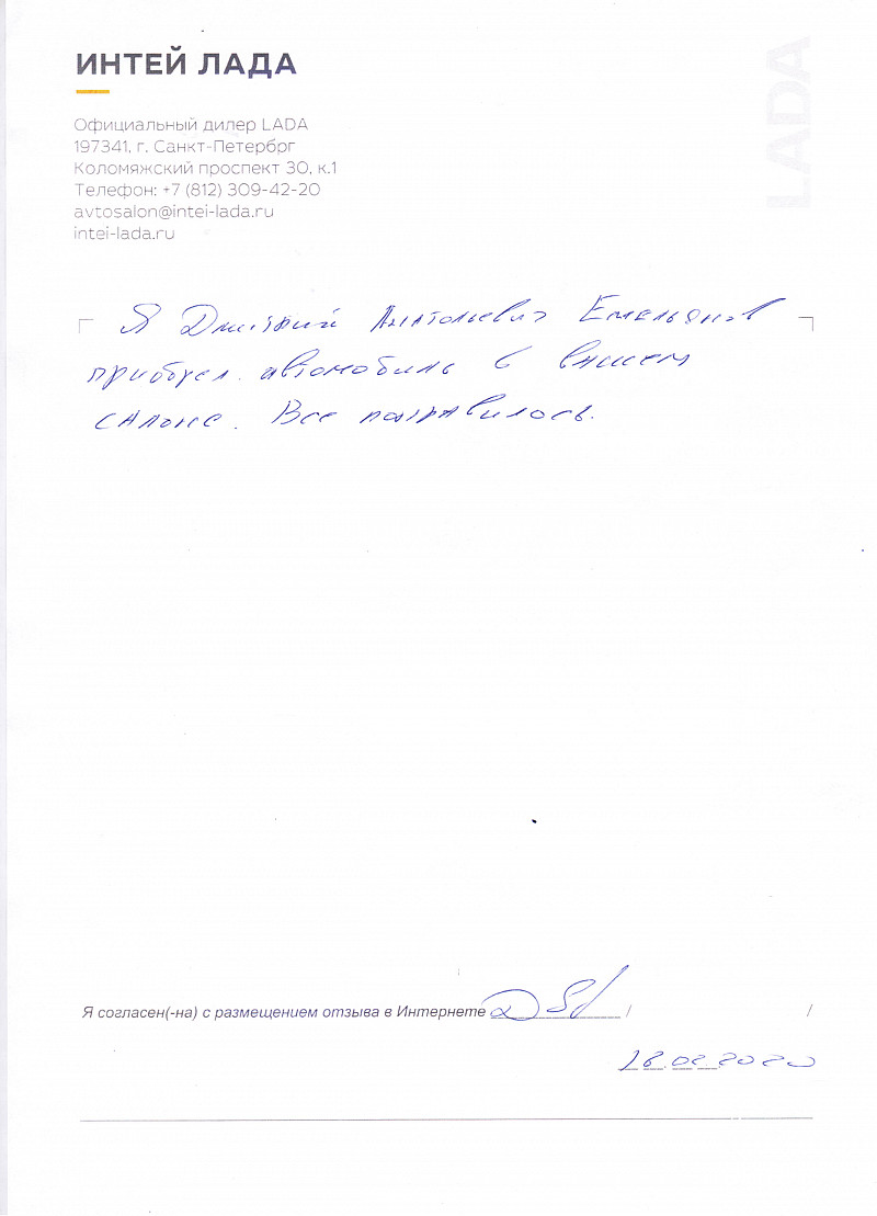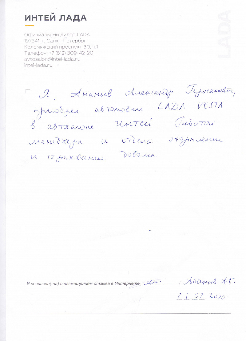 Я, Ананьев Александр Германович, приобрел автомобиль LADA VESTA в автосалоне ИНТЕЙ. Работой менеджера и отдела оформления и страхования доволен. |
