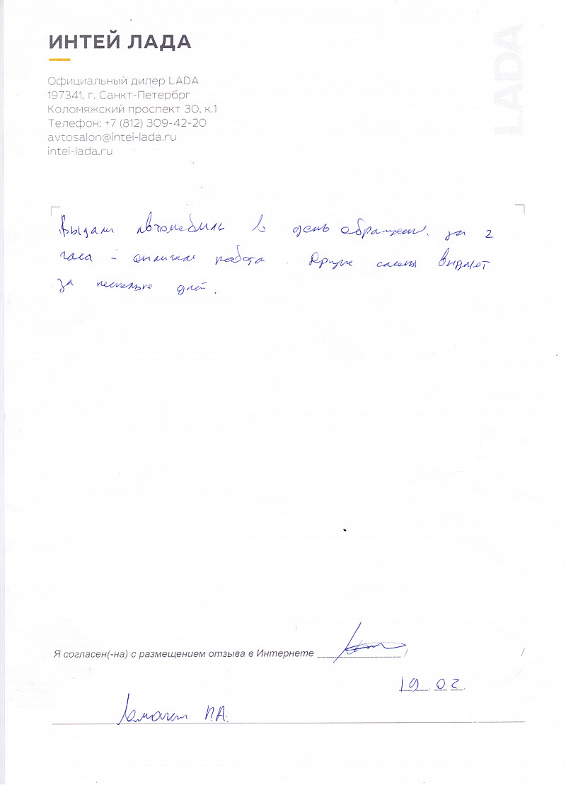 Хочется выразить огромную благодарность менеджеру Роману. Он не только помог определиться с автомобилем (и вообще с выбором марки Lada), но и сделал все от него зависящее, чтобы я получила свой автомобиль как можно раньше. Вообще в салоне Интей- Лада очень вежливый и отзывчивый персонал, очень грамотно и последовательно сопровождают на всех этапах сделки: выбор авто, выбор комплектации, дополнительных услуг, подготовка и оформление документов, кредитование и опции, страхование, дальнейшее обслуживание. В случае спорных или неожиданных ситуаций всегда пытаются помочь клиенту, сделать дополнительную скидку или подарок. Все честно и прозрачно. Забрала автомобиль в день подписания документов. Сами автомобили Lada очень изменились в лучшую сторону со времен ВАЗ-2107. Рекомендую марку Lada и салон Лада-Интей для покупки! |