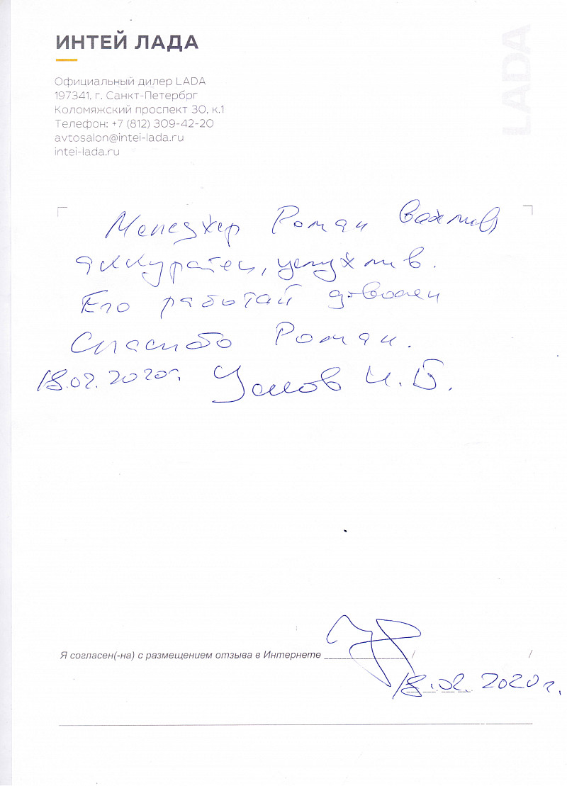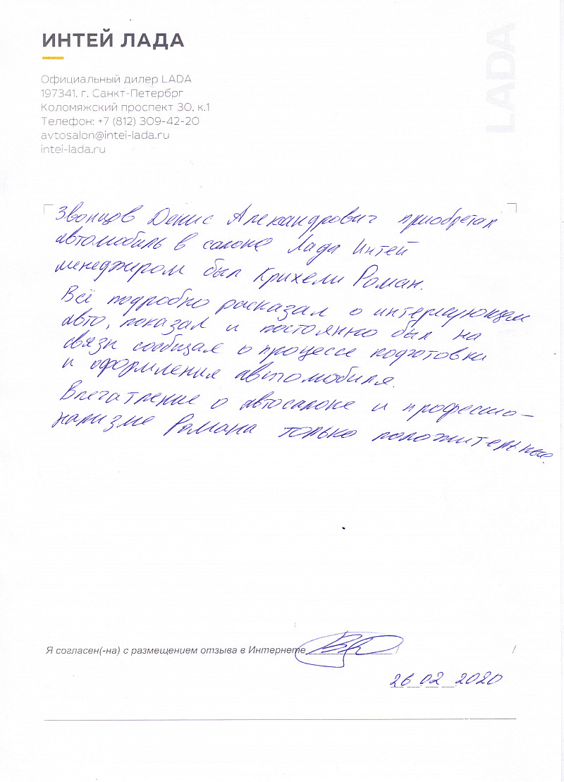 Звонцов Денис Александрович приобретал автомобиль в салоне Лада Интей. Менеджером был Крихели Роман. Всё подробно рассказал о интересующем авто, показал и постоянно был на связи, сообщал о процессе подготовки и оформления автомобиля. Впечатление о автосалоне и профессионализме Романа только положительные. |
