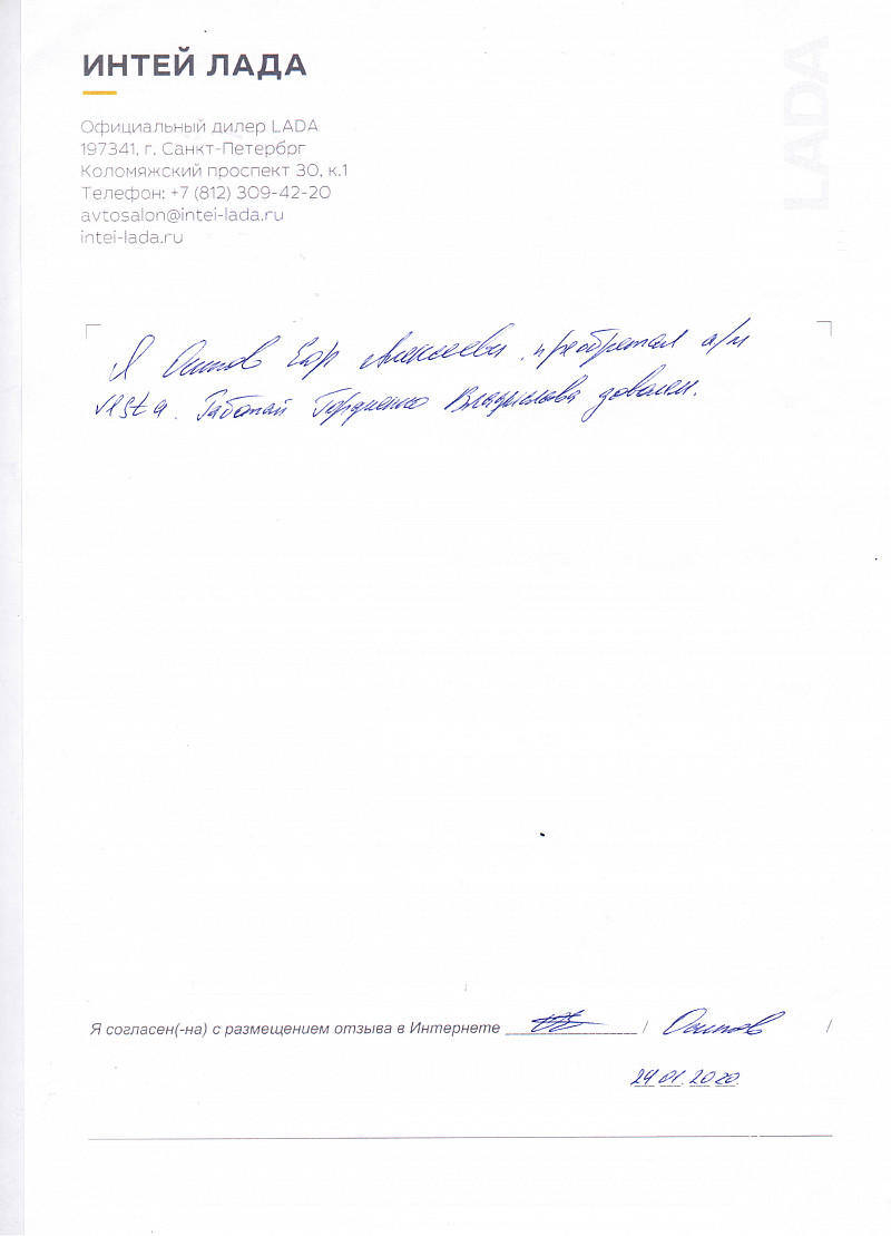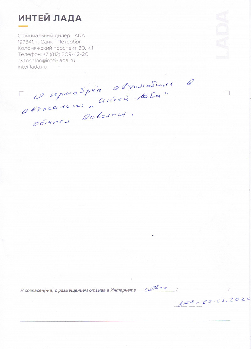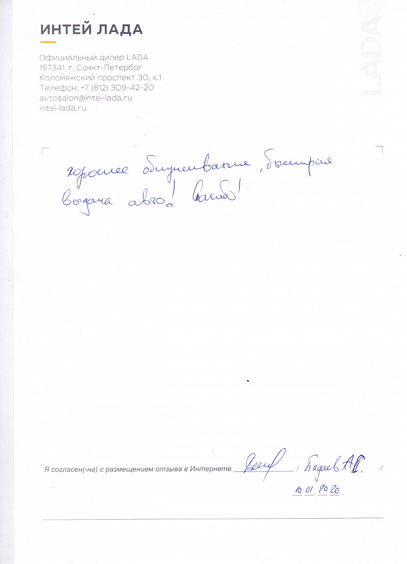 Я, Шувакина Валентина Алексеевна, приобрела автомобиль ЛАДА LARGUS в салоне ИНТЕЙ 09.01.2020. Все менеджеры были очень гостеприимны и квалифицировано отвечали на все мои вопросы. Было приятно общаться. Обслуживание на высоте. |