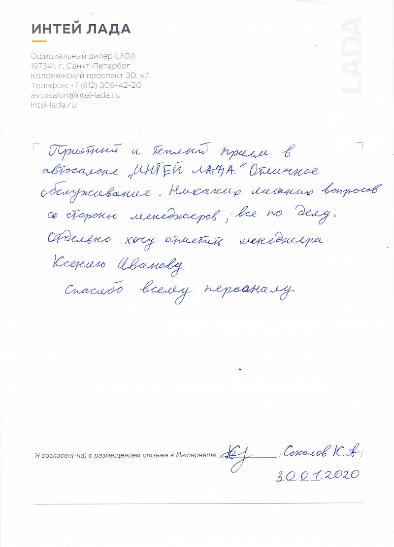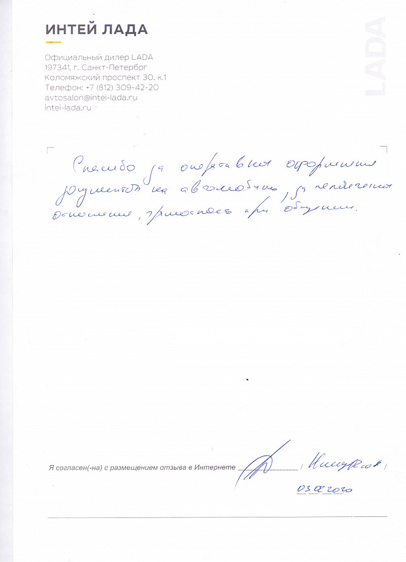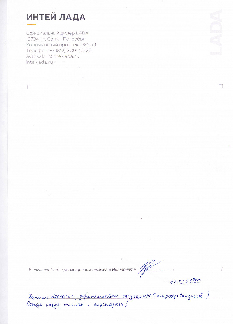 Приятный и теплый прием в автосалоне "ИНТЕЙ ЛАДА". Отличное обслуживание. Никаких лишних вопросов со стороны менеджеров; все по делу. Отдельно хочу отметить менеджера Ксению Иванову. Спасибо всему персоналу. |