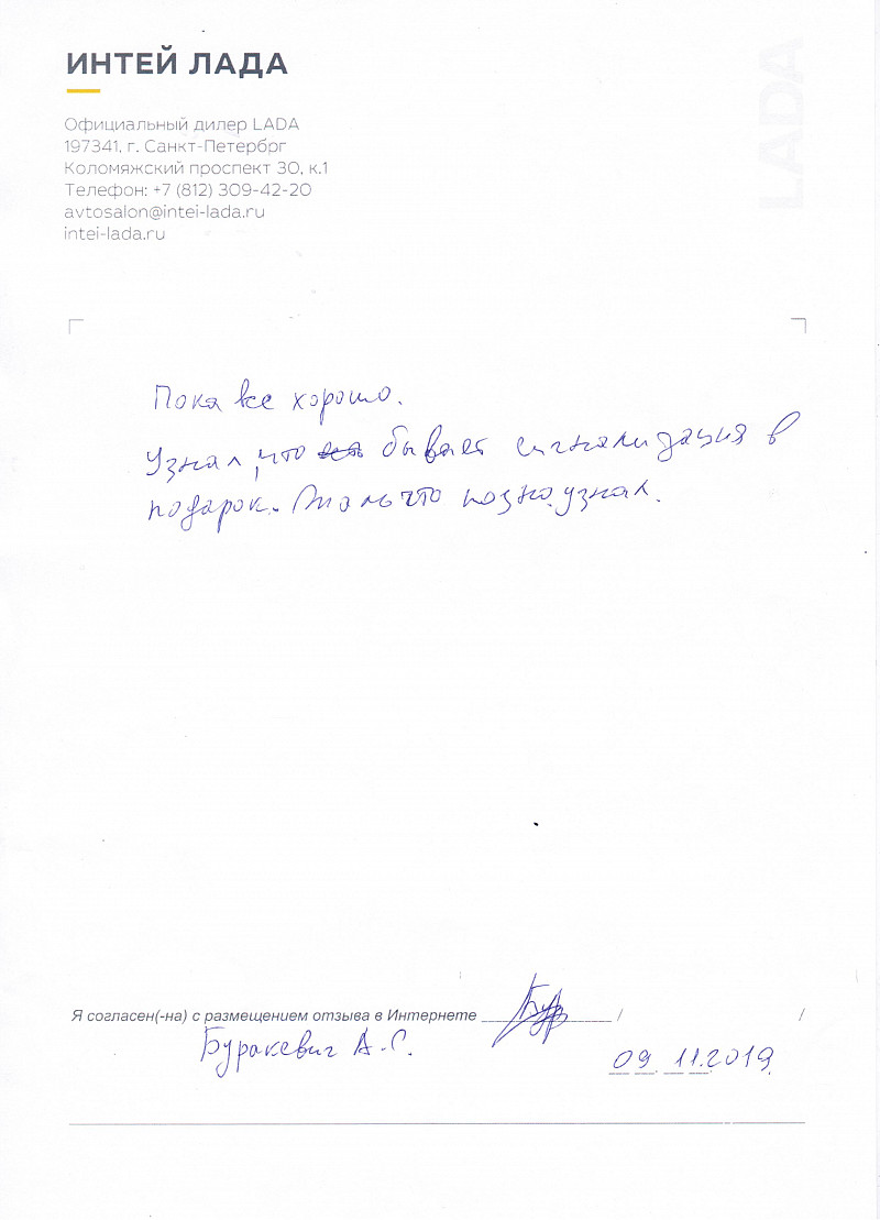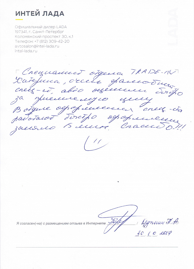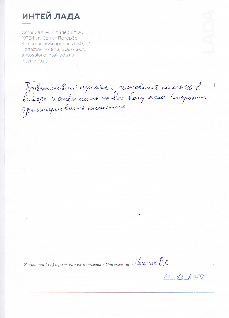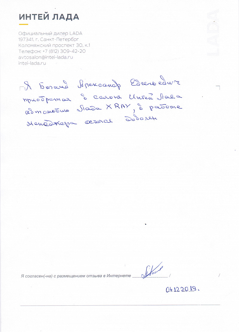 Я, Богачев Александр Евгеньевич, приобретал в салоне Интей Лада автомобиль Лада XRAY, в работе менеджера остался доволен. |
