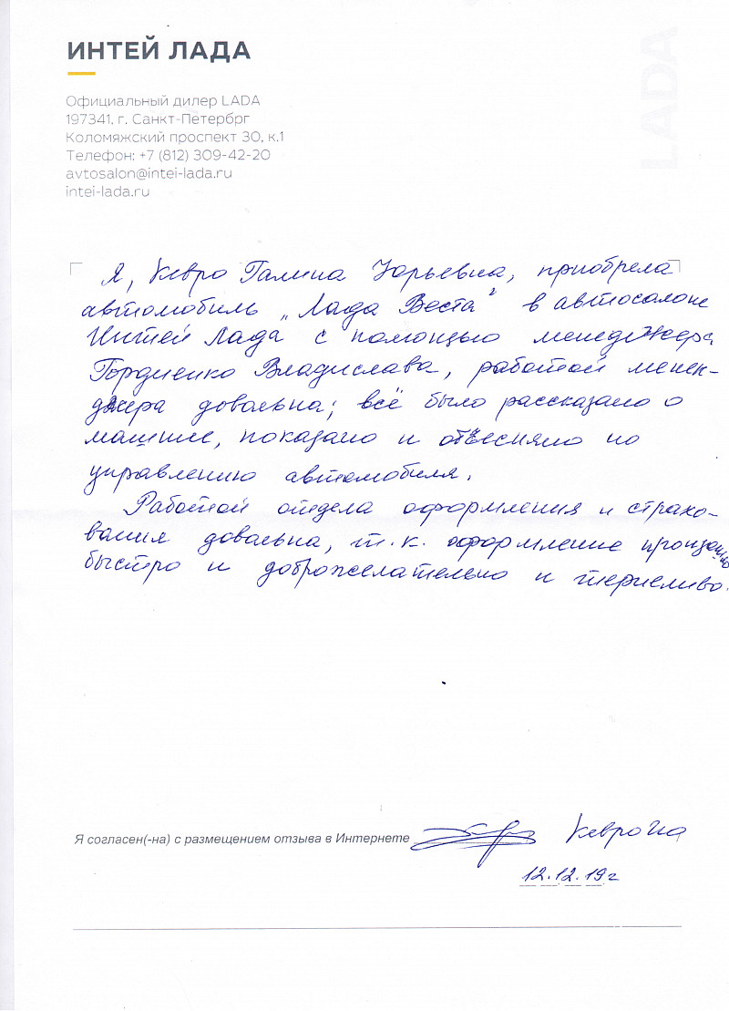 Я, Кевро Галина Юрьевна, приобрела автомобиль "Лада Веста" в автосалоне Интей Лада с помощью менеджера Гордиенко Владислава, работой менеджера довольна; все было рассказано о машине, показано и объяснено по управлению автомобиля. Работой отдела оформления и страхования довольна, т.к. оформление произошло быстро, доброжелательно и терпеливо. |