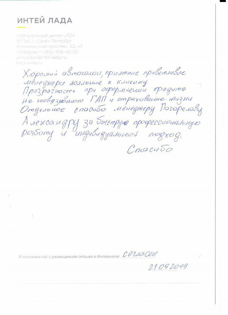 Благодарим всех сотрудников компании "Интей Лада" за помощь в выборе, профессионализм и оперативность. |
